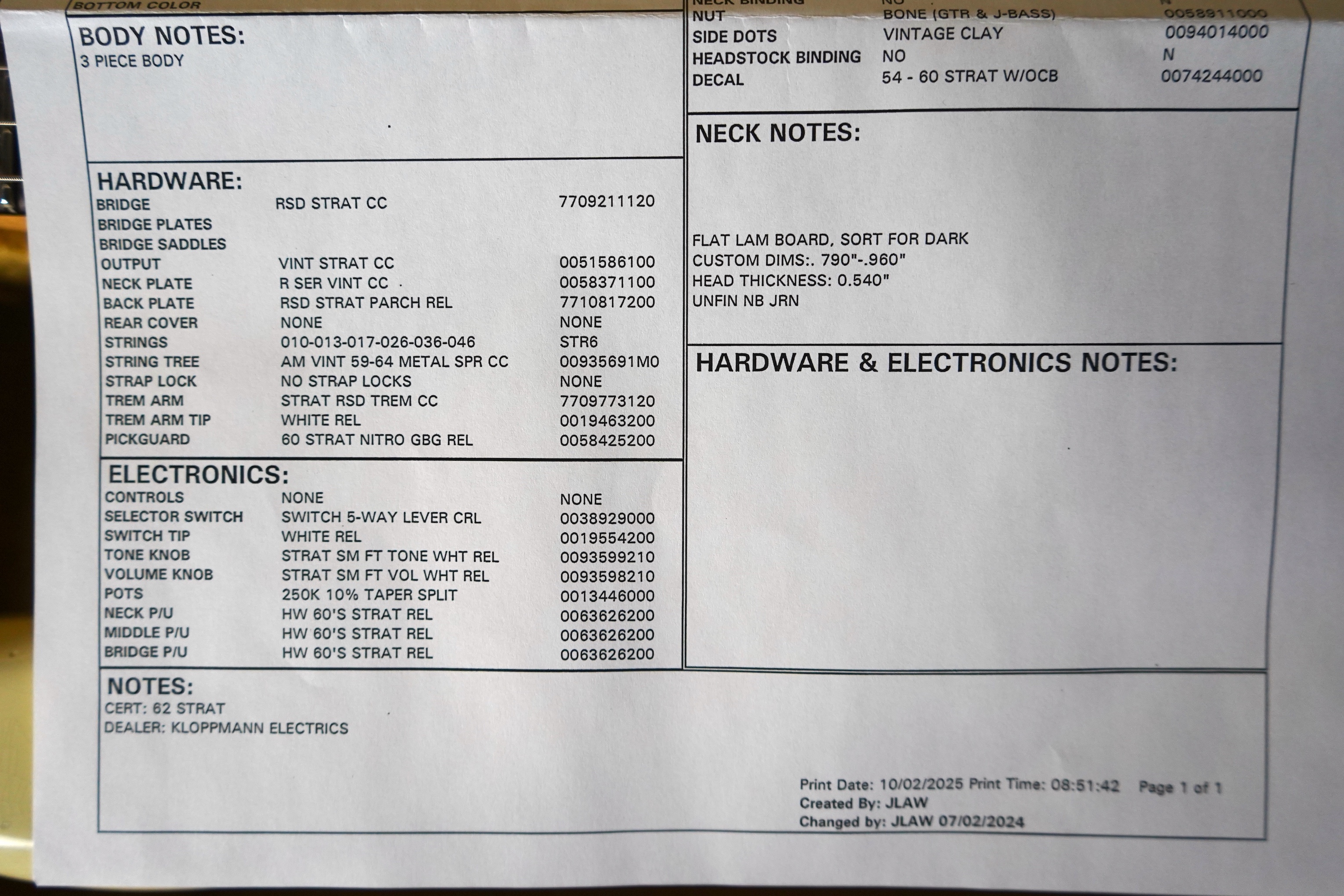 Auch bei der Hardware wurde auf authentische Details und optimale Funktion geachtet: eine RSD Strat Bridge, Vintage-Mechaniken mit Fender-Logo, ein Knochensattel für optimale Schwingungsübertragung sowie klassische Vintage Clay Dot Inlays im Griffbrett. Der Hals ist mit Nitrocellulose-Lack versiegelt, was für ein besonders natürliches und eingespieltes Spielgefühl sorgt.